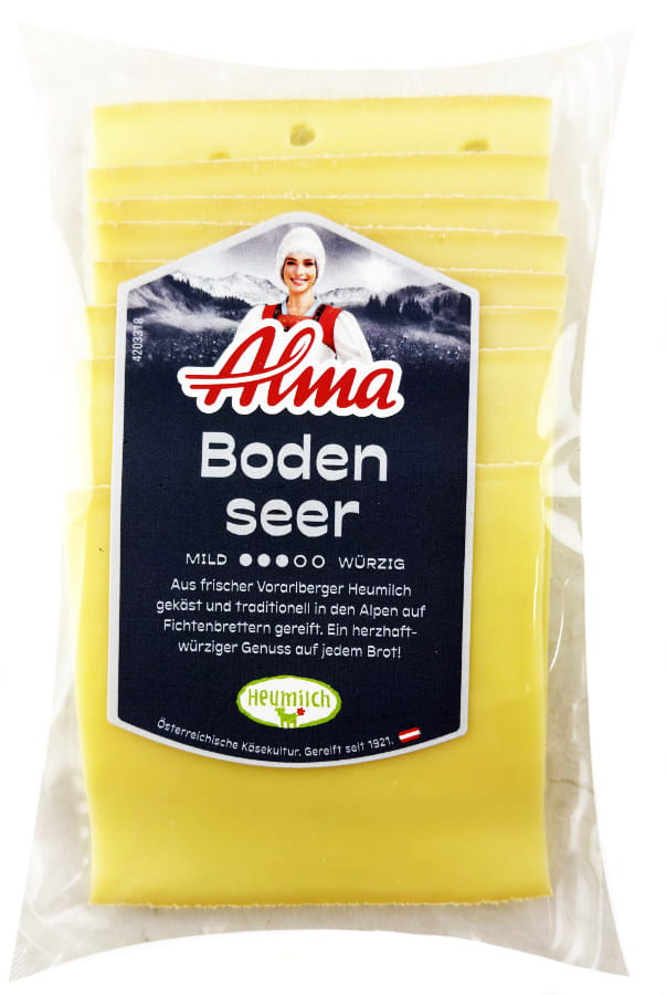 Alma Bodenseer - aus frischer Vorarlberger Heumilch und traditionell auf Fichtenbrettern gereift.