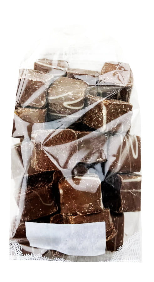 Dominosteine mit 38% Fruchtfüllung und 20% Edelmarzipan von 23% weisser Schokolade überzogen und einem Dekor aus 1% Schokoladenkuvertüre