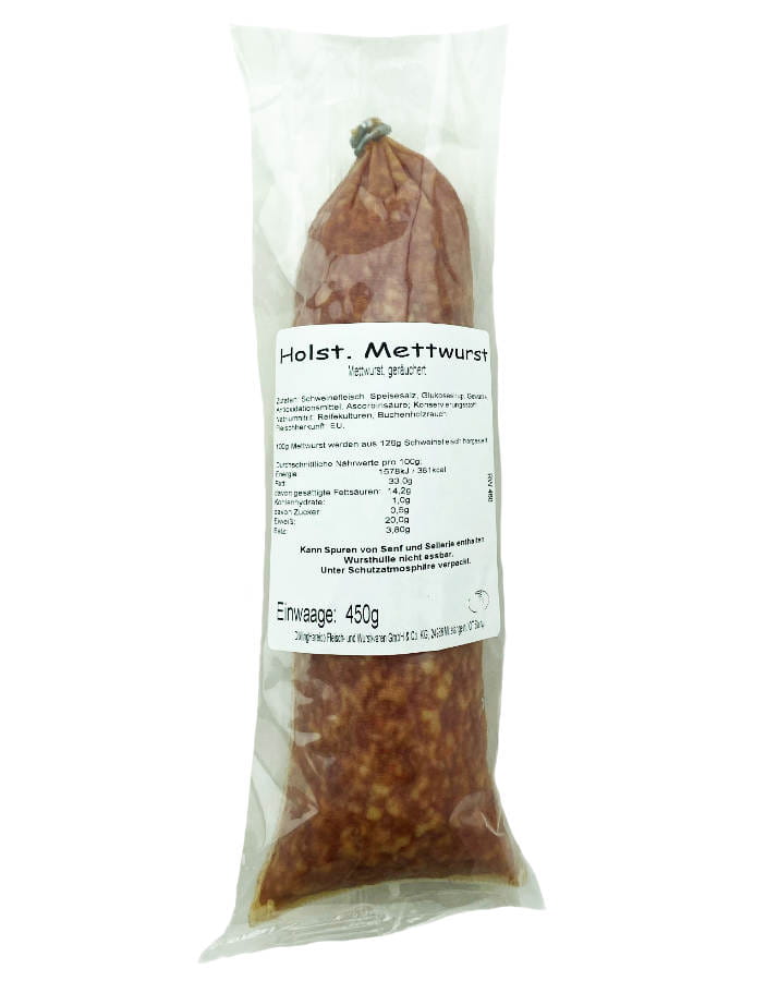 Zutaten: Schweinefleisch (85%), Trinkwasser, Speisesalz, Gewürze (enthalten SENF, SELLERIE), Glukosesirup, Stabilisator: Diphosphate, Antioxidationsmittel: Ascorbinsäure, Konservierungsstoff: Natriumnitrit, Schafsaitling, Buchenholzrauch